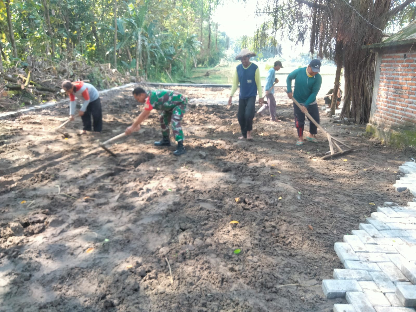 Suasana kebersamaan tampak jelas di lokasi kegiatan. Babinsa dan warga bekerja bahu-membahu memasang paving blok di jalan dusun yang menjadi akses utama menuju pemukiman warga.