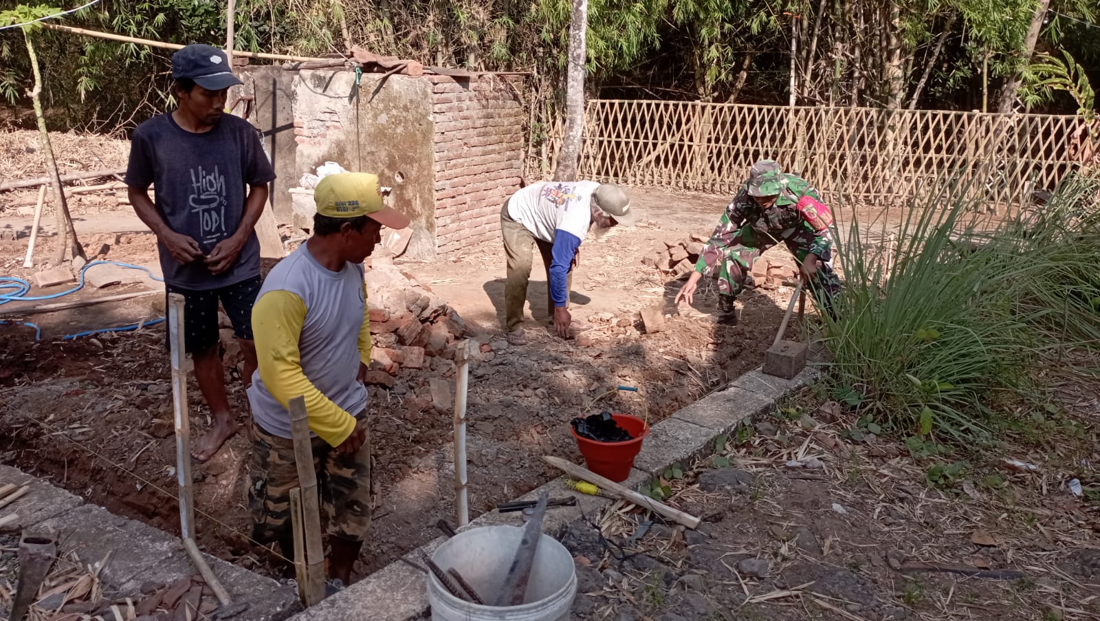 Nganjuk – Guna mewujudkan sinergitas antara TNI dan rakyat, Babinsa Koramil 0810/03 Loceret Serda Suhadi bersama warga melaksanakan kerja bakti pembangunan rumah di Desa Sombron, Kecamatan Loceret, Kabupaten Nganjuk.