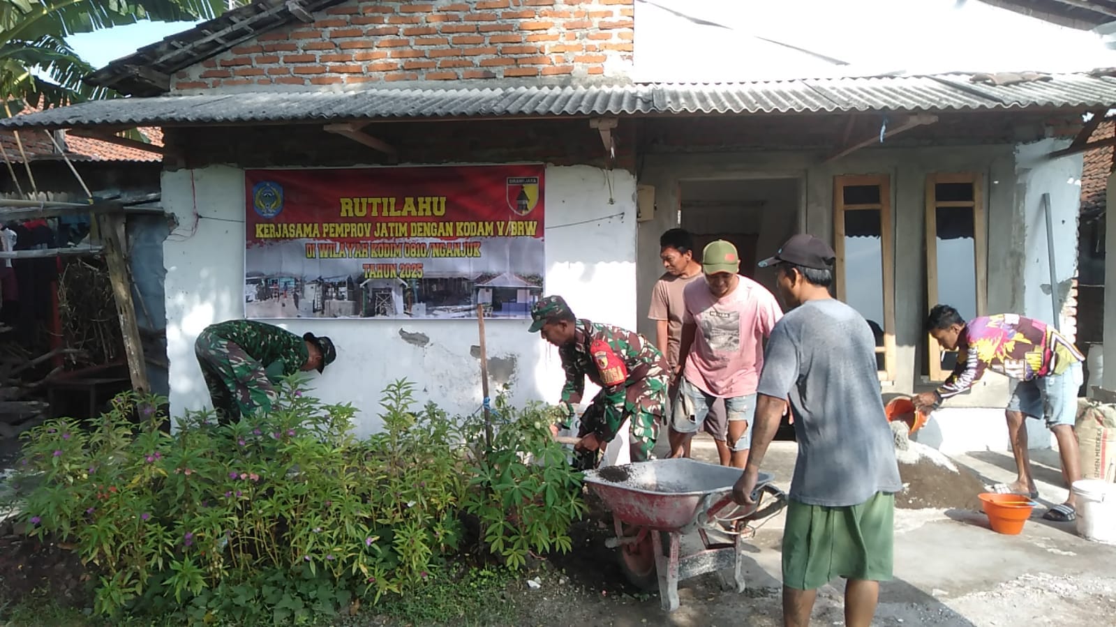 Nganjuk – Anggota Koramil 0810/10 Tanjunganom bersama warga melaksanakan kegiatan gotong royong merenovasi Rumah Tidak Layak Huni (RTLH) milik warga binaan di RT 02 RW 02, Lingkungan Pule, Kelurahan Tanjunganom, Rabu (8/10/2025).