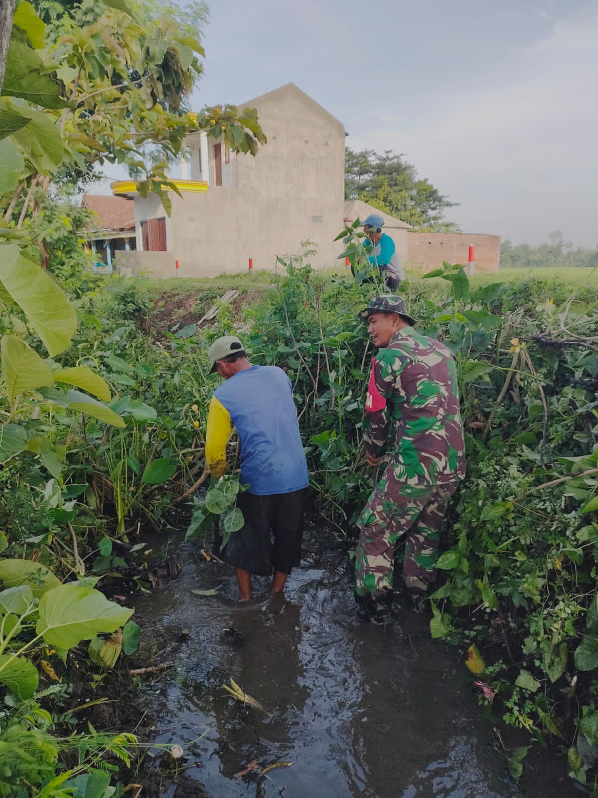 Babinsa Prambon Bersama Warga Gotong Royong Bersihkan Aliran Sungai di Desa Kurungrejo