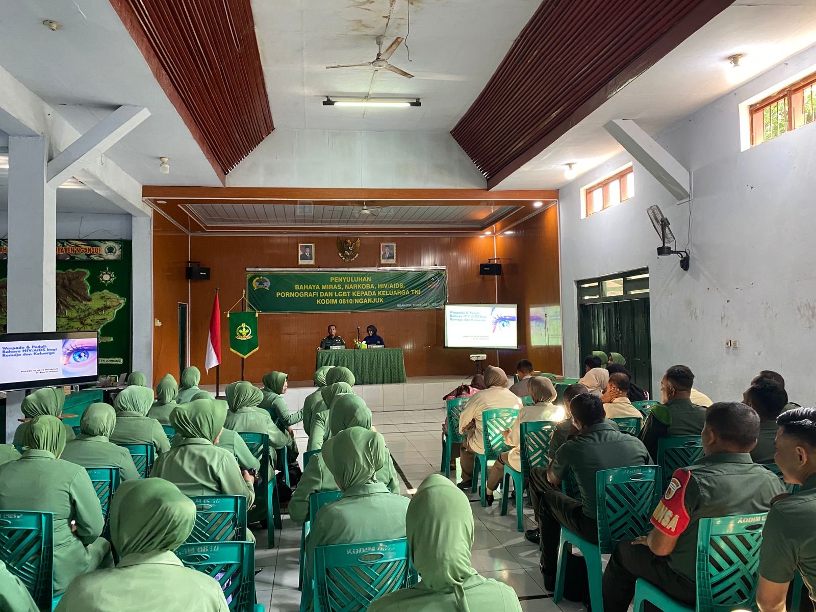 Nganjuk, – Dalam upaya membentengi keluarga prajurit dari pengaruh negatif perkembangan zaman, Kodim 0810/Nganjuk menggelar kegiatan penyuluhan tentang bahaya minuman keras, HIV/AIDS, pornografi, dan LGBT bertempat di Aula Makodim 0810/Nganjuk, Kamis (9/102025).