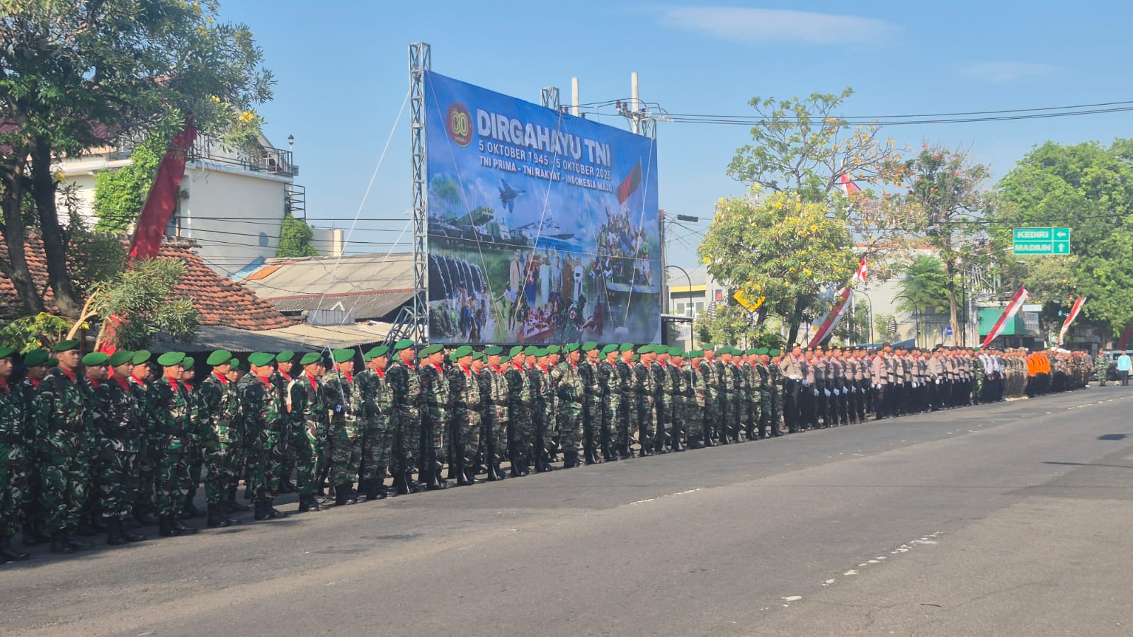 Nganjuk — Upacara Peringatan Hari Ulang Tahun (HUT) ke-80 Tentara Nasional Indonesia (TNI) 05 Oktober 2025 digelar secara khidmat di ruas Jalan Madiun–Surabaya, tepatnya di depan Makodim 0810/Nganjuk, Jl. Panglima Sudirman, pada Sabtu (5/10/2025).
