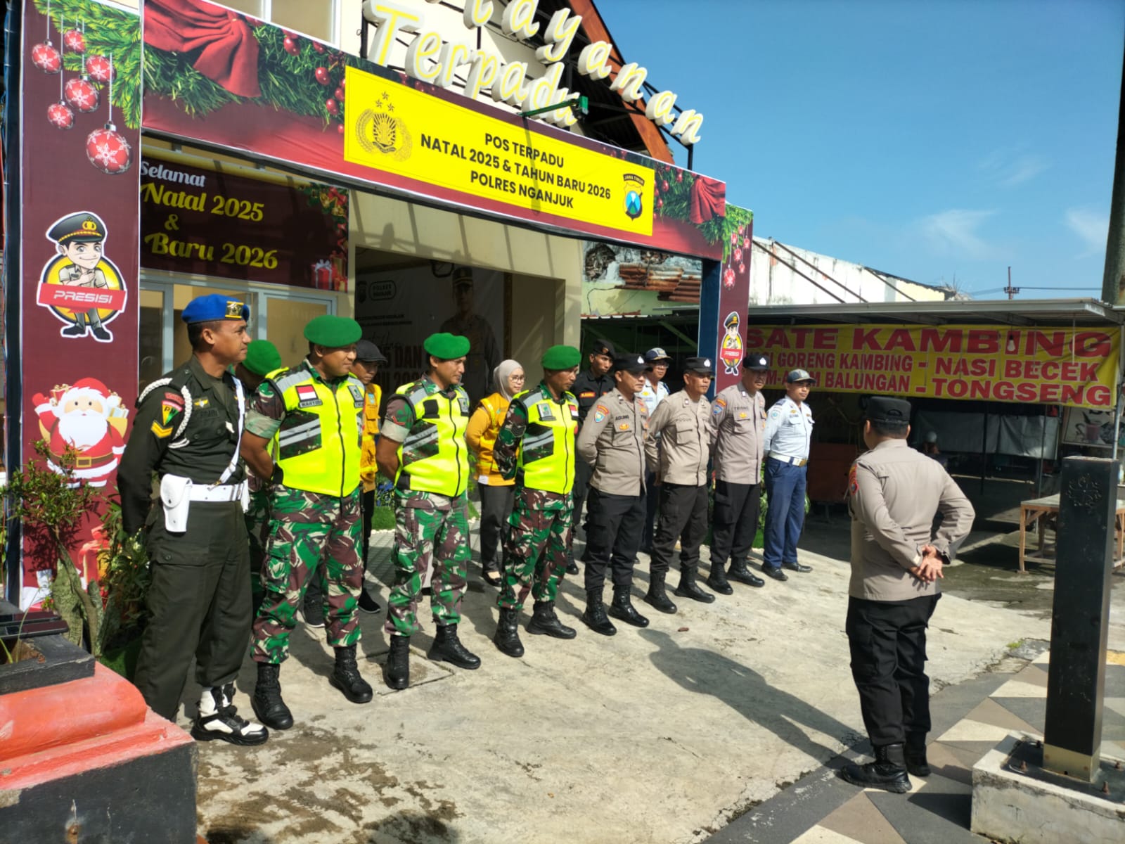 Nganjuk – Dalam rangka menciptakan situasi yang aman dan kondusif selama perayaan Natal dan Tahun baru (Nataru), Babinsa Koramil 0810/18 Ngatos bersama unsur TNI, Polri, Pol PP, serta instansi terkait melaksanakan pengamanan gabungan di Pos Natal dan Tahun Baru bersama di tempat strategis jl. Ahmad yani pada Kamis 25 Desember 2025.
