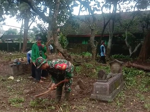Nganjuk – Babinsa Desa Blongko Koramil 0810/18 Ngetos Kodim 0810/Nganjuk, Sertu Asep Indra Gunawan, bersama masyarakat melaksanakan kerja bakti pembersihan Tempat Pemakaman Umum (TPU) yang berlokasi di Dusun Tengger, Desa Blongko, Kecamatan Ngetos, Jumat (19/12/2025).