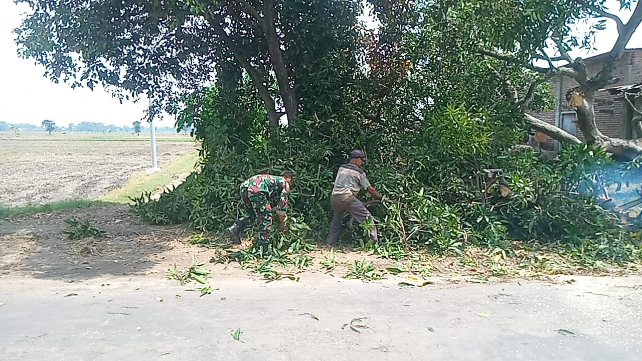 Nganjuk – Babinsa Koramil 0810/10 Tanjunganom, Serka Purnomo, melaksanakan Karya Bakti dengan membantu pengamanan jalan saat proses pemotongan pohon mangga milik Bapak Rohmad, warga Dusun Klempun, Desa Sonobekel, Kecamatan Tanjunganom, Kabupaten Nganjuk, pada Selasa (9/12/2025).