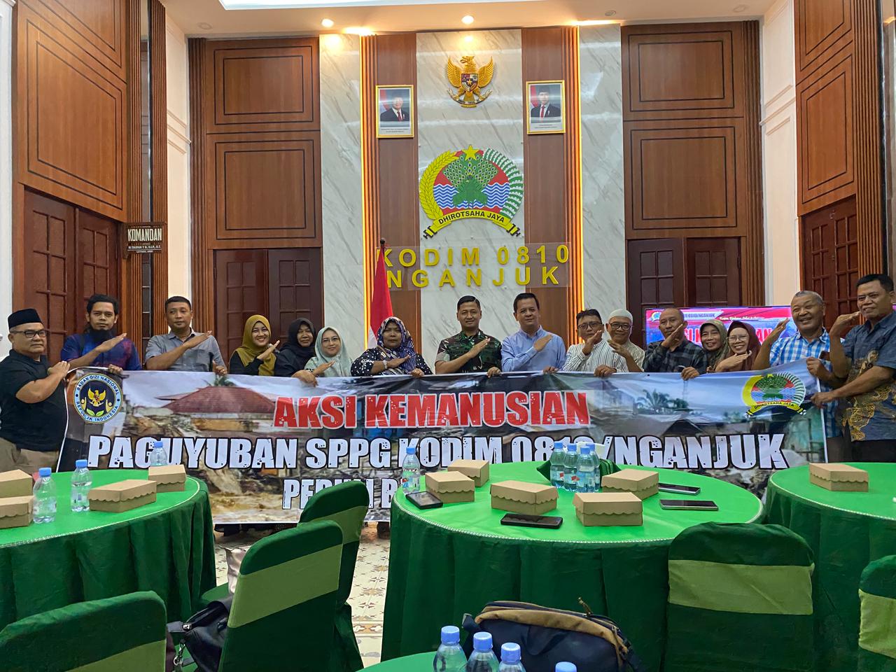 Bantuan kemanusiaan tersebut diserahkan secara langsung oleh Ketua Paguyuban SPPG, Ahmad Choderi, S.T., kepada Komandan Kodim (Dandim) 0810/Nganjuk, Letkol Arh M. Taufan Yudha Bakti, S.I.P., S.T., bertempat di Makodim 0810/Nganjuk, pada Senin (22/12/2025).