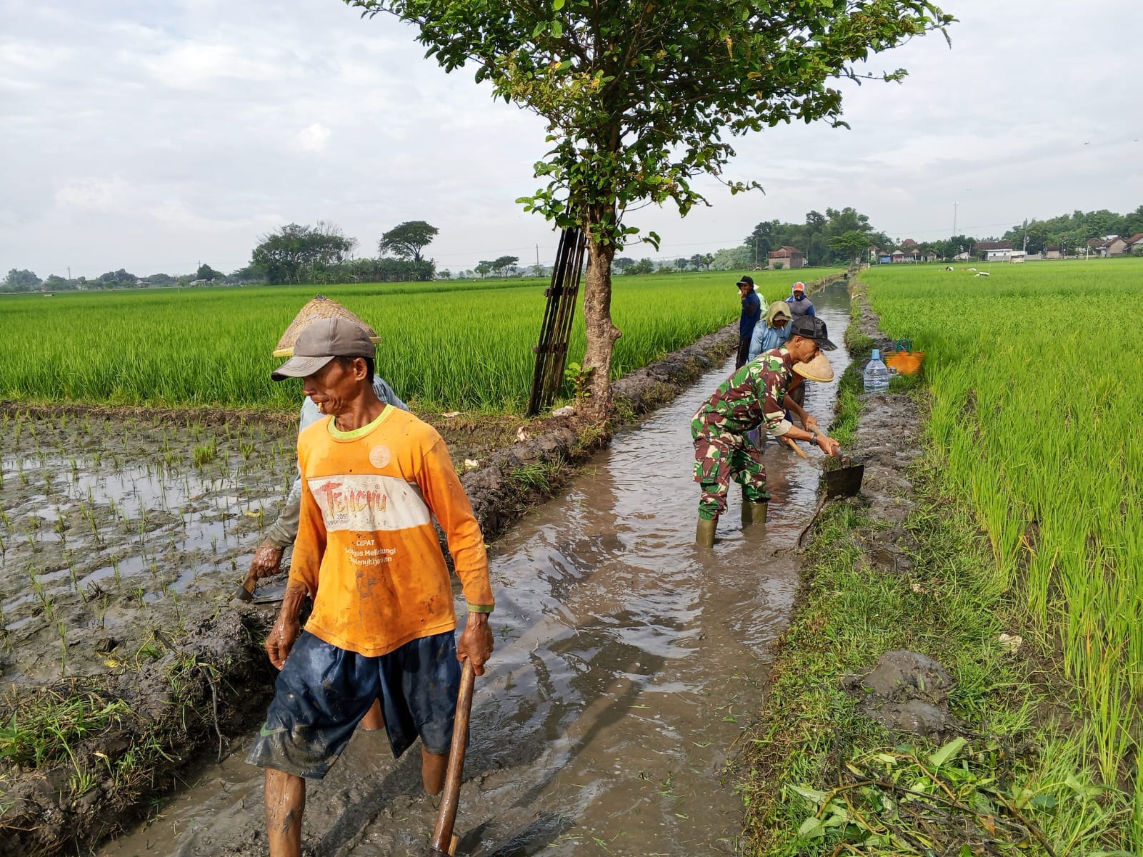 Tanjunganom – Koramil 0810/10 Tanjunganom, Serka Purnomo Babinsa Desa Sonobekel melaksanakan Kegiatan Karya Bakti membersihkan saluran irigasi agar air mengalir lancar keswah para petani dengan perangkat desa dan masyarakat Dusun Klempun Desa Sonobekel Kecamatan Tanjunganom Kabupaten Nganjuk, 26/1/2026.