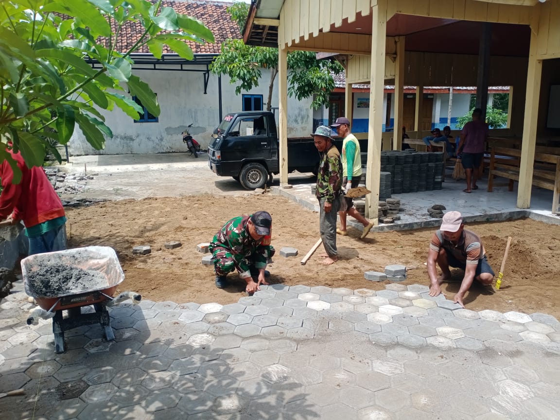 Nganjuk – Sebagai wujud kepedulian terhadap pembangunan sarana dan prasarana desa. Babinsa Desa Tritik, Koramil 0810/15 Rejoso, Sertu Hendro Prasetyo bersama perangkat desa dan warga masyarakat melaksanakan kegiatan kerja bakti pemasangan paving di halaman Balai Desa Tritik, Kecamatan Rejoso, Kabupaten Nganjuk. Rabu (07/01/2025)