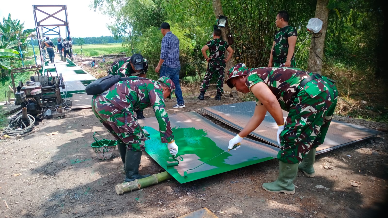 Bersama warga, ia aktif dalam proses persiapan hingga perakitan material jembatan.