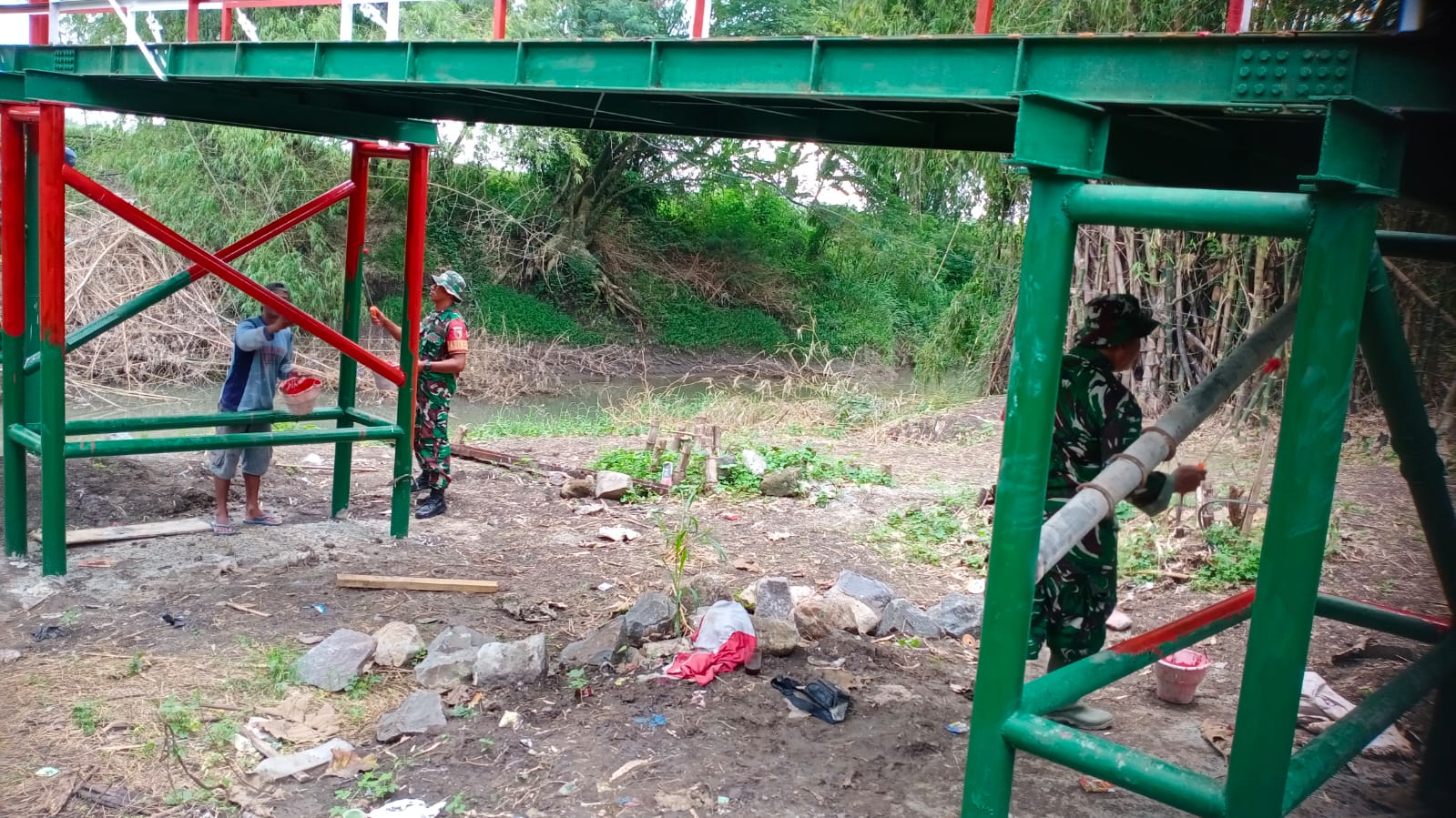 Di lapangan, Babinsa bersama masyarakat tampak kompak melaksanakan sejumlah pekerjaan lanjutan, mulai dari pengecatan rangka baja, perapian konstruksi, hingga pembersihan area sekitar jembatan. Kebersamaan tersebut mencerminkan kuatnya kemanunggalan TNI dan rakyat yang selama ini menjadi fondasi utama dalam setiap kegiatan teritorial.