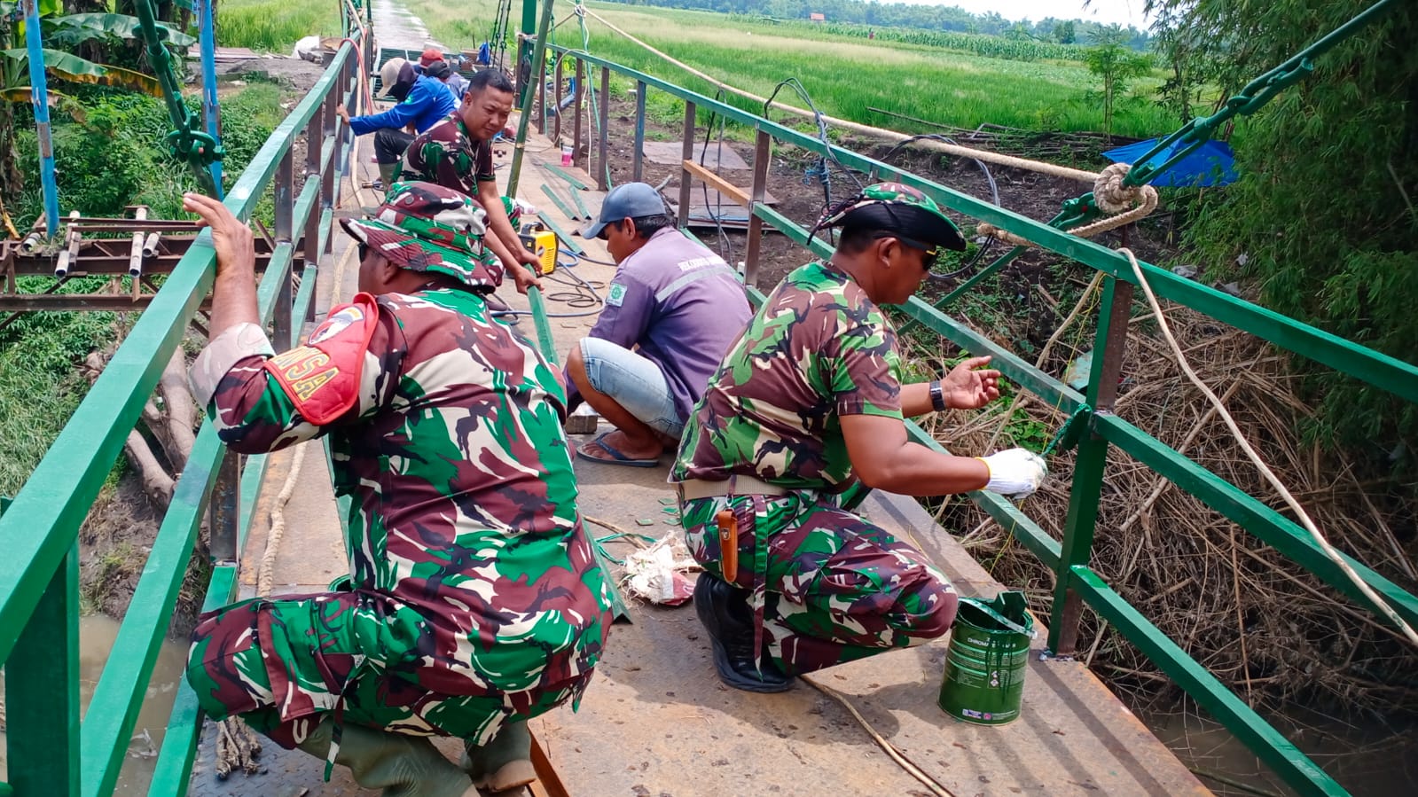 Salah satu kegiatan yang tampak di lapangan adalah pengecatan pagar jembatan yang dilakukan langsung oleh Babinsa Desa Bagor Wetan, Serka Heru S. Dengan penuh dedikasi, ia turun tangan memastikan setiap bagian pagar tertutup cat secara merata dan rapi.