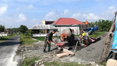 Nganjuk – Dalam rangka membantu meningkatkan sarana pendukung sektor pertanian serta mempererat kemanunggalan TNI dengan rakyat, Babinsa Desa Blitaran Koramil 0810/16 Sukomoro Kodim 0810/Nganjuk, Sertu Sunyoto, melaksanakan kegiatan kerja bakti bersama anggota Kelompok Tani (Poktan) Sri Rejeki dalam pemadatan tanah uruk jalan menuju area persawahan di Dusun Mlaten, Desa Blitaran, Kecamatan Sukomoro, Kabupaten Nganjuk.