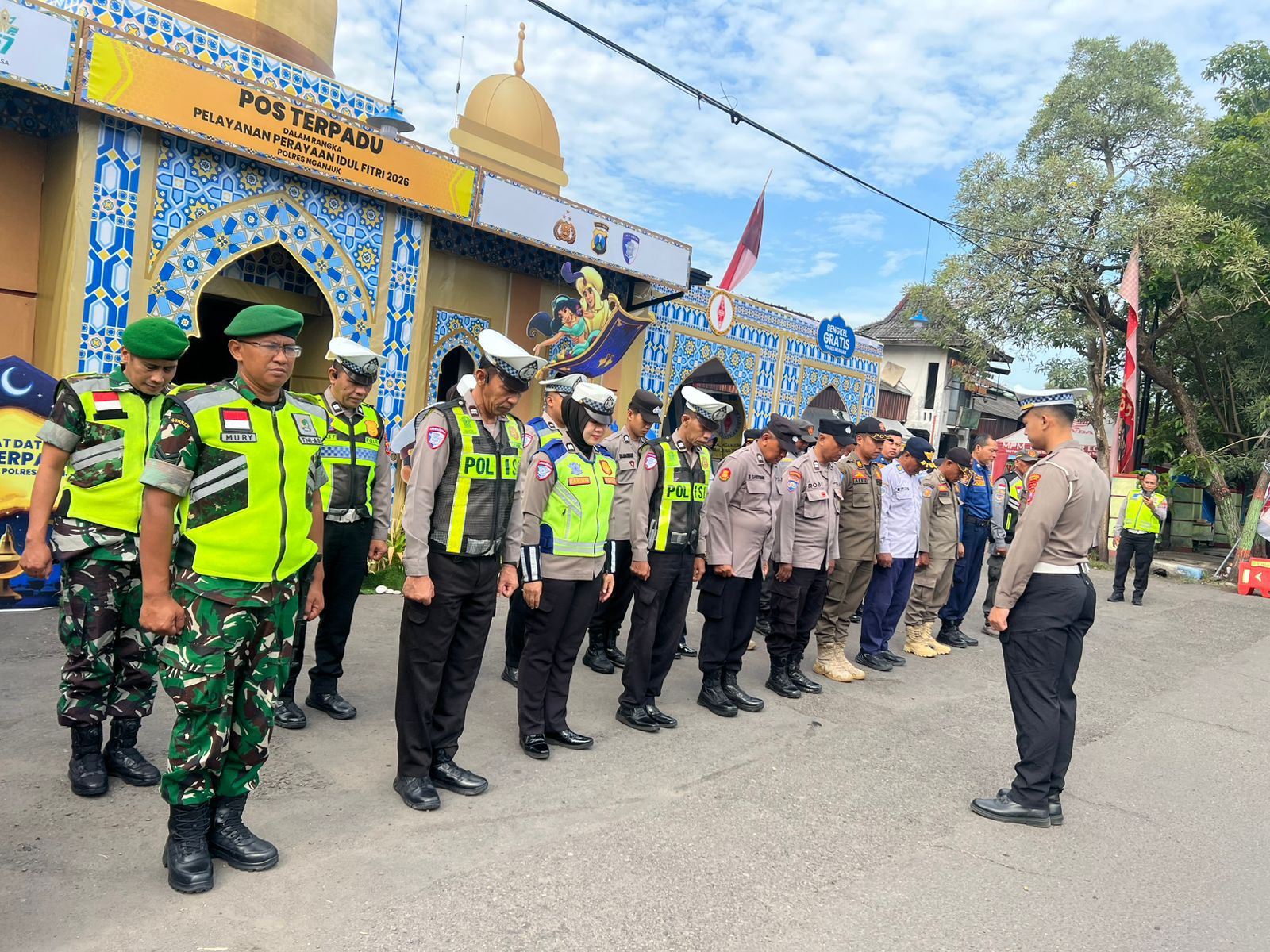 Dalam rangka mendukung kelancaran dan keamanan arus mudik Hari Raya Idul Fitri, jajaran TNI AD melalui Babinsa Kodim 0810/Nganjuk turut serta melaksanakan pengamanan di Pos Terpadu yang berada di wilayah Kabupaten Nganjuk. Kegiatan ini dilaksanakan bersama unsur Polri, Dinas Perhubungan, Satpol PP, serta instansi terkait lainnya sebagai bentuk sinergitas lintas sektoral dalam memberikan pelayanan terbaik kepada masyarakat.
