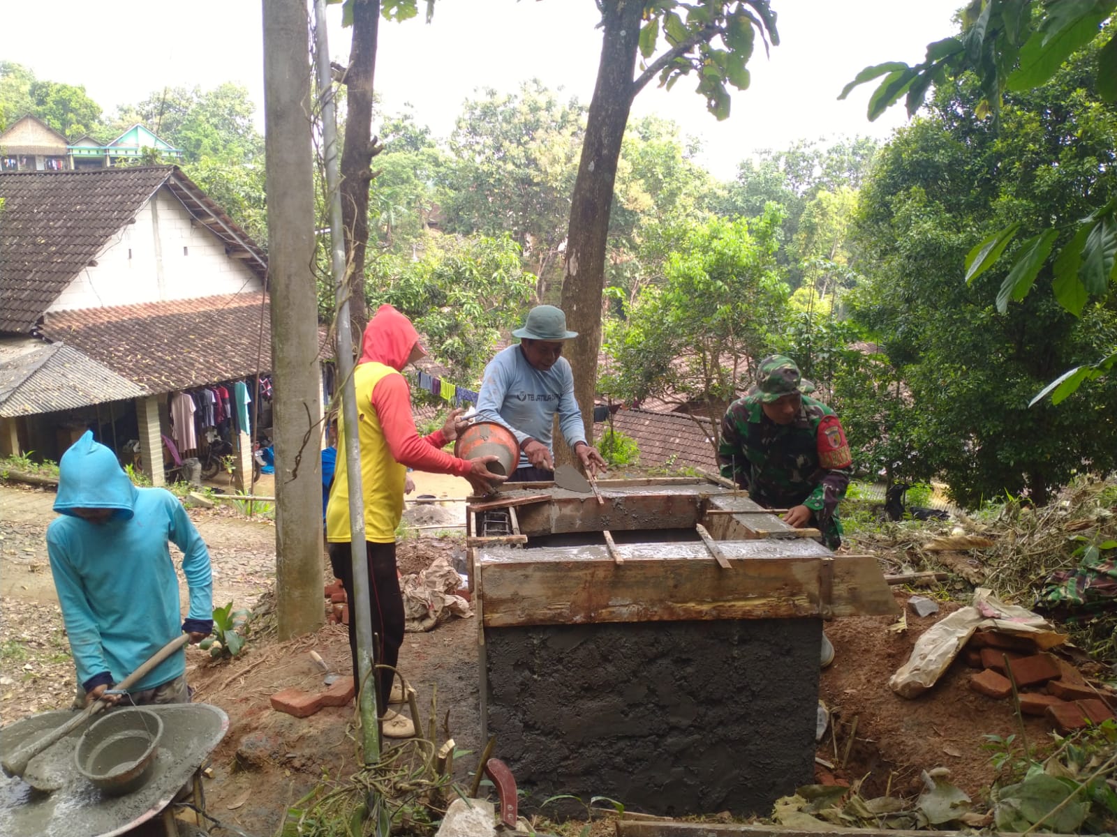Seperti terlihat di lokasi, Babinsa bersama warga bahu-membahu mengerjakan pembangunan sarana pendukung air bersih, mulai dari pengecoran dudukan hingga pemasangan instalasi pipa. Semangat kebersamaan tampak jelas dalam setiap proses pengerjaan yang dilakukan.