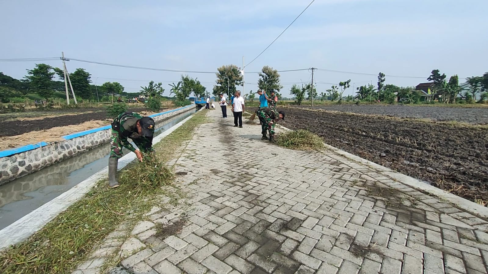 Kegiatan karya bakti tersebut dilaksanakan di sepanjang akses jalan dan saluran irigasi persawahan desa, dengan melibatkan personel TNI bersama masyarakat setempat. Tampak para prajurit bersama warga bergotong royong membersihkan rumput liar di sepanjang jalan paving serta merapikan area sekitar saluran air guna menjaga kelancaran irigasi pertanian.